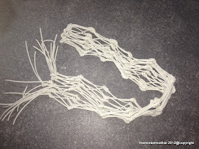 Tornando al tutorial ho tagliato 10 pezzi di cordino di 2 metri l'uno, poi li ho annodati tra loro iniziando dal centro ed andando avanti (la distanza tra i nodi è di 5 cm) Dopo ho bloccato i cordini incollandoli con 2 pezzi di pelle, dove ho anche agganciato il manico...fatto sempre con il cordino, come? Bè ho usato 4 fili di circa 38 cm ed ho arrotolato il cordino sopra per poi bloccarlo con i ganci di una catena. Questa è la base ed anche come potete usarla, però per avere 2 borse in una ho creato una base, semplicemente rivestendo una scatola con della pelle...